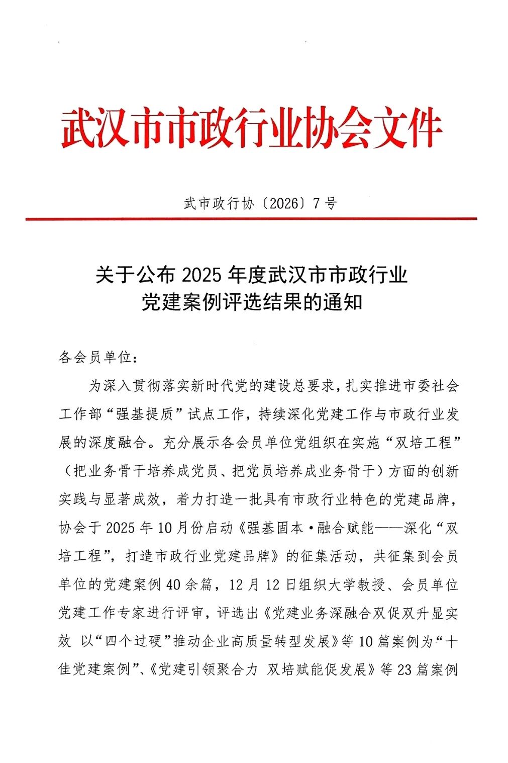 ? ? 近日,武漢市市政行業(yè)協(xié)會(huì)發(fā)布《2025年度武漢市市政行業(yè)黨建案例評(píng)選結(jié)果》,武漢市政院申報(bào)的創(chuàng)新實(shí)踐案例——《“雙培工程”鑄尖兵,黨建引領(lǐng)促發(fā)展》入選“十佳黨建案例”。