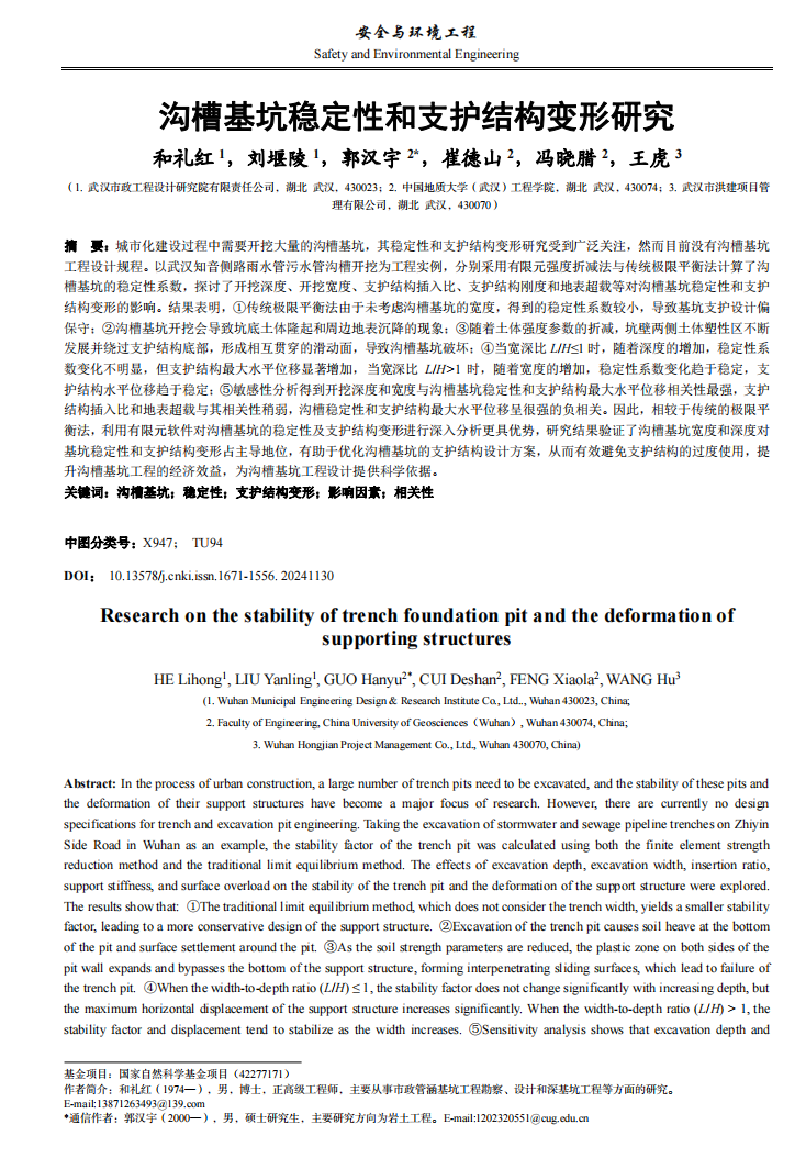 《市政管涵基坑穩(wěn)定性和支護(hù)結(jié)構(gòu)變形研究》被中文核心期刊《安全與環(huán)境工程》正式錄用。論文圍繞市政管涵基坑工程的核心安全問題,通過大量工程實踐與理論分析,為基坑穩(wěn)定性評價與變形控制提供了堅實的理論支撐與計算方法。