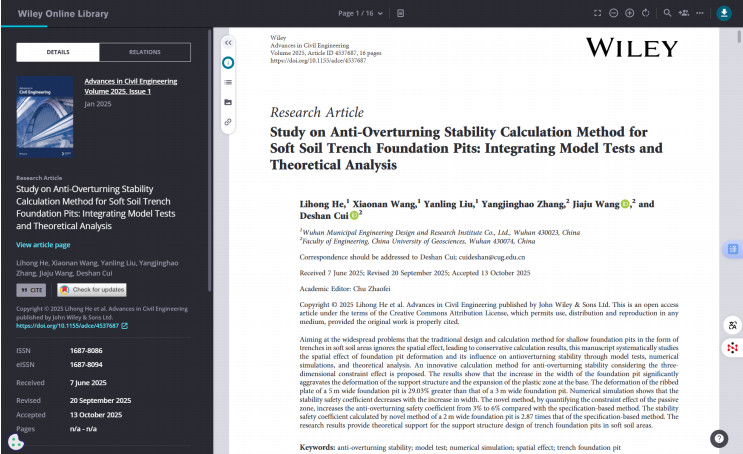 《Study on Anti-Overturning Stability Calculation Method for Soft Soil Trench Foundation Pits: Integrating Model Tests and Theoretical Analysis》成功被 Wiley Online Library 旗下國際權(quán)威期刊 Advances in Civil Engineering 收錄。論文針對軟土地區(qū)市政管涵基坑抗傾覆穩(wěn)定性難題,創(chuàng)新性地融合了室內(nèi)模型試驗分析與典型工程實踐經(jīng)驗,提出了更精準(zhǔn)的計算方法,研究成果已被 SCI 檢索,標(biāo)志著公司在巖土領(lǐng)域的技術(shù)研究水平達(dá)到國際前沿。